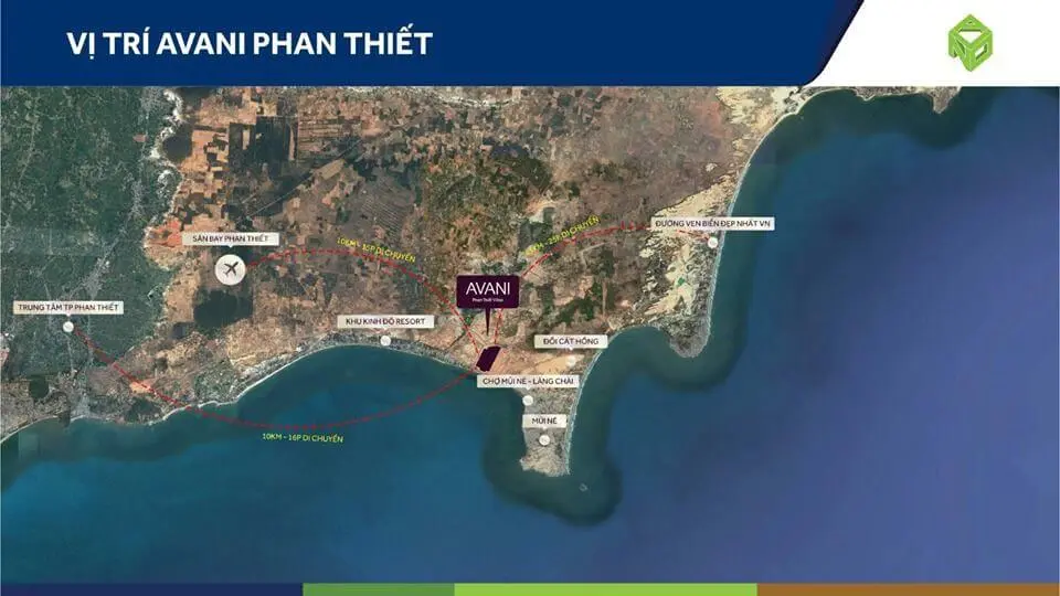 Dự án đất nền Phan Phiết Avani cách 10 phút để di chuyển đến sân bay Phan Thiết. Từ dự án, cư dân nhanh chóng tiếp cận với các danh lam thắng cảnh nổi tiếng như bãi biển Vịnh Hòn Rơm, suối Cô Tiên, rãnh Đá Đỏ, đồi cát vàng, đồi cát hồng, chợ Mũi Né, làng chài, tháp chăm Po Sah Inư, rạng dừa Hàm Tiến,…